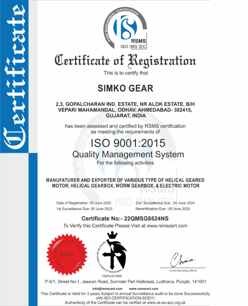 A Certificate of Registration for ISO 9001:2015 confirms that an organization meets these quality standards. It includes the company’s name, certification scope, registration details, and validity period. For example, SIMKO GEAR, a manufacturer and exporter of helical geared motors, helical gearboxes, worm gearboxes, and electric motors, ensures quality compliance through this certification.